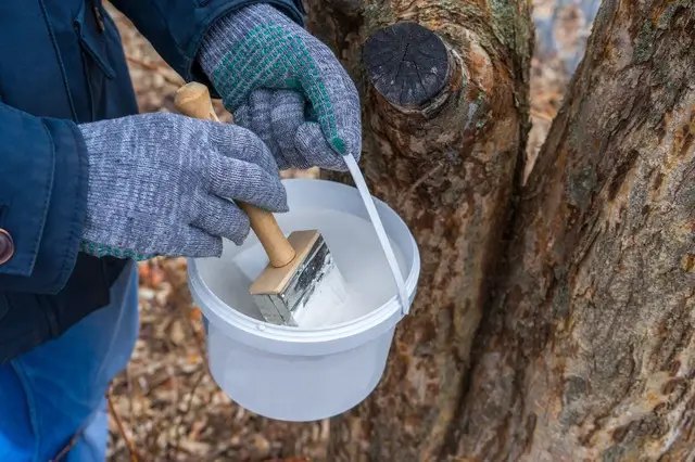 Білити дерева найкраще у сухий та погожий день, щоб вони встигли добре просохнути. Найпростішим варіантом буде використати для цього звичайну садову водоемульсійну фарбу. Проте більшість господарів віддають перевагу вапняним розчинам, які готують самостійно. Ось найпростіший та найпопулярніший рецепт: