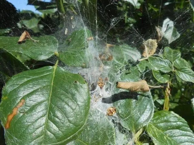 - Поява тонкої павутини (спочатку на верхівці, а потім й на інших частинах рослини).