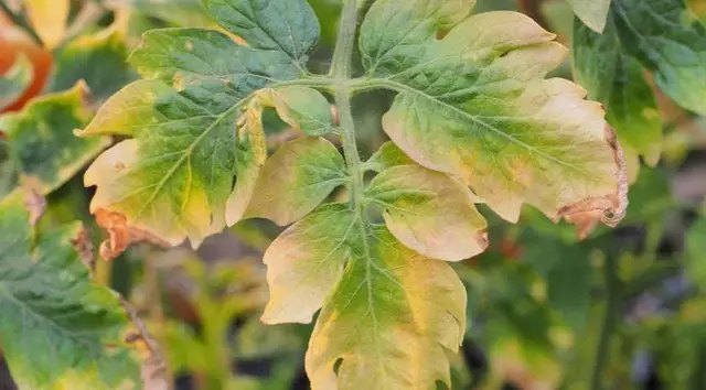 - Дефіцит магнію. При нестачі магнію пожовклі листки швидко буріють та відмирають. Щоб зупинити цей процес, потрібно правильно підживлювати рослини. На початку сезону для цього рекомендовано використати магнієву селітру. У другій половині липня при перших ознаках дефіциту вноситься добриво Калімагнезія або ж сульфат магнію.